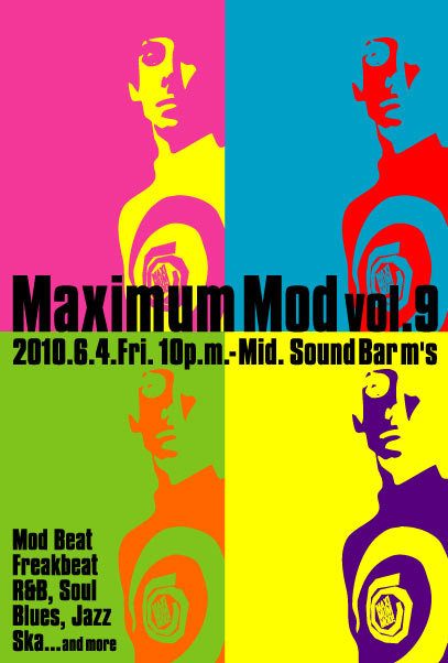 先週5/8に20周年を迎え大盛況だった「MODS MAYDAY NAGOYA 2010」。 その「MODS MAYDAY NAGOYA 2010」でもDJプレイし会場を沸かせた“MAXIMUM”な4人のモダニストによる『MAXIMUM MOD vol.9』開催。 60年代当時のORIGINAL MODSがダンスしていたR&B、SOUL、BLUES、R&R、GIRL GROUP、JAZZ、SKA、さらに黒人のフィーリングに溢れたBRITISH BEATやレアなFREAKBEATを幅広くプレイ。 MOD的フィルターを通した60sミュージック、ファッション、ダンスなど60年代カルチャーのすばらしさを体感できる。 まさにMAXIMUM!!60年代、世界で最も“Hip”で“Sw
