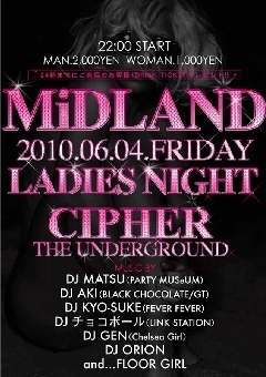 管理人様、告知失礼いたします。 もし不適切であれば、削除を宜しくお願いいたします。 ☆★☆★☆★☆★☆★☆★☆★☆★☆★☆★☆★☆★☆★☆★ 久しぶりにCIPHER THE UNDERGROUNDでLADIES NIGHTが開催される。 GUESTには長年DANCE BATTLEやEVENTにも出場し、全国のDANCERから熱い支持を受けている「DJ MATSU」 そしてCIPHERの第4土曜日開催の「BLACK CHOCOLATE」看板DJ、「DJ AKI」 間違いなくダンサンブルな一夜をメイクしている2人とココUNDERGROUNDで平日、 週末と間違いないPARTYに参加しているDJを中心に、花の金曜日を