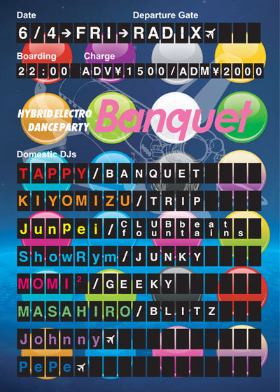 告知、失礼します 22:00 OPEN Banquet -HYBRID ELECTRO DANCE PARTY- DJs: TAPPY(Banquet) KIYOMIZU(TRIP) JunPei(CLUB beat/fountains) ShowRym(JUNKY) MOMI²(GEEKY) MASAHIRO(BLITZ) Johnny PePe [料金] ADV:1,500YEN ADM:2,000YEN ※別途1D必要 [Lコード]40920 TICKET INFO: ローソンチケット(0570-000-777[オペレーター対応:10:00〜20:00]、 http://l-tike.com/) [INFO] RADIX 052-332-0073