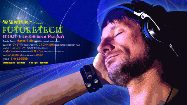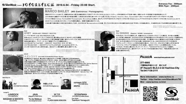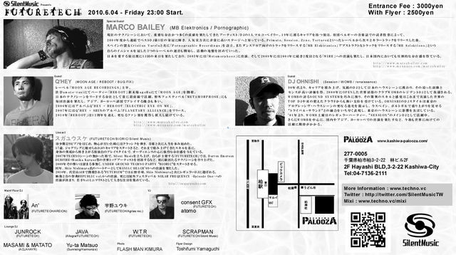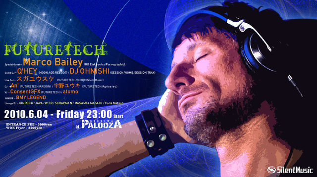 UNITでのREPUBLICでは1500人を動員し、 ageHa Warter Barでのpartyも大成功に終わらせた Silent Musicが贈るFUTURETECHが【Marco Baily】 【Q`HEY】【DJ OHNISHI 】と共に 柏に帰ってきました!! 進化したFUTURETECHをこの目でご覧ください! ディスカウントも受け付けておりますので お気軽にメッセ頂ければ幸いです! Silent Music Presents FUTURETECH 2010.6.4(Fri) @柏 PALOOZA Door : 3,000yen W/F : 2,500yen ■SPECIAL GUEST Marco Bailey (MB Elektronics/Pornographic) ■GUEST DJ Q'HEY (MOON