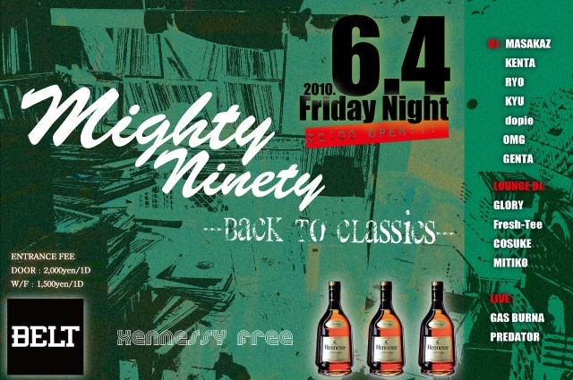 管理人様告知失礼致します。 不適切な場合は削除御願い致します。 80'sや90'sのHIPHOP,R&Bがお好きな皆様お待たせしました!! 偶数月第一金曜の『MIGHTY NINETY』がやって参りました。 毎回たくさんのお客様が朝まで踊り狂っているGOOD PARTYです! イベント当日にはHENNESYを振舞います。 お時間のある方は是非遊びに来てください!! 6/4(金) HIPHOP,R&B 『MIGHTY NINETY』 -BACK TO CLASSICS- OPEN 22:00- DJ: ■MASAKAZ ■KENTA ■RYO ■KYU ■dopie ■OMG ■GENT