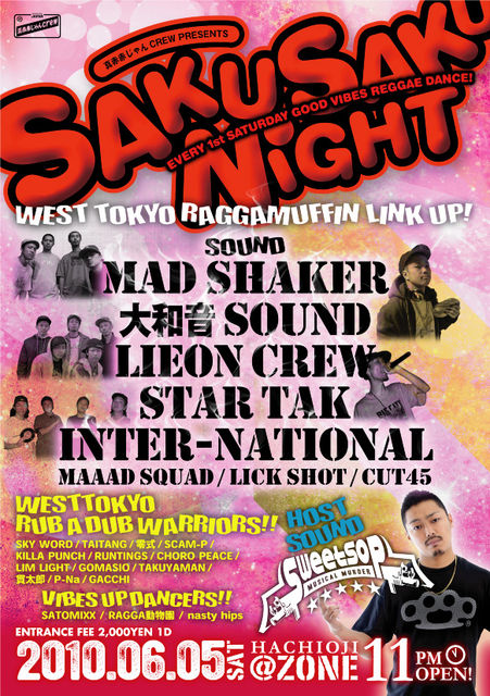 TITLE / 真赤赤じゃんCREW presents SAKUSAKU NIGHT 西東京RAGGAMAFIN LINK UP DAY / 6月5日(SAT) PLACE / 八王子ZONE 八王子市横山町13−4 ニューシネマビル B1F 0426-20-4739 OPEN / 23:00 〜 5:00 PRICE / ¥2000/1D ■HOST SOUND / SWEETSOP ■SOUND / MAD SHAKER 大和音SOUND LIEON CREW STAR TAK INTER-NATIONAL MAAAD SQUAD LICK SHOT CUT45 ■DEE JAY / SKY WORD TAITANG 零式 SCAM-P KILLA PUNCH RUNTINGS CHORO PEACE LIM LIGHT GOMAS