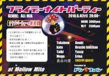 ■2010.6.4(Fri) 22:00open [フライデーナイトパーティー] All Mix DJ> Takabow. Kato. Taiki. Megu. 長谷川潤 STAFF> Gouki. Drastic Kinchan. Yassy. Erina FEE: W/F \2.500(1d) : DAY \3.000(1d) ■フライデーナイトパーティー CLUB PARTYの新提案! 20:00スタートで会社帰りや飲み会の後でもすぐ楽しめます。 ピークタイムも終電前に一回あります! 遅い時間CLUBに行くのが大変な方や次の日仕事がある方などにピッタリ! 社会人対応型PARTY! もちろん大学生の方にも特典があり、20:00〜21:00までのHAPPY HOURに学生証を提示していただき