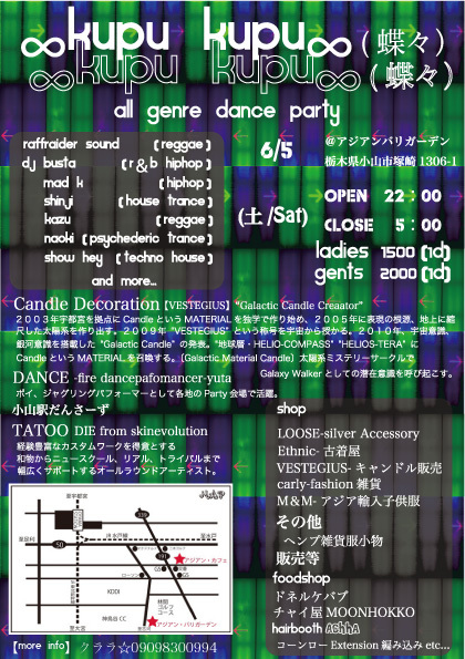 ∞KUPU KUPU∞(蝶々) 〜オールジャンルDance Party〜 6/5(土) @アジアンバリガーデン 栃木県小山市塚崎1306-1 OPEN 22:00 CLOSE 5:00 森の中にある 隠れ家的Event会場 アジアンバリガーデンで 気持ちいい音楽と 美味しいお酒で まったり揺れたり 広いgardenで ジャンベやポイを楽しんだり アーティストPerformanceに 魅入ったり 楽しみ方は∞FREEEEE∞ 皆さんのご来場お待ちしてます☆ LOVE&PEACE raffraider sound(Reggae)DJ BUSTA (R&B) DJ MAD-K (HIPHOP) DJ shinji(HOUSE&TRANCE)