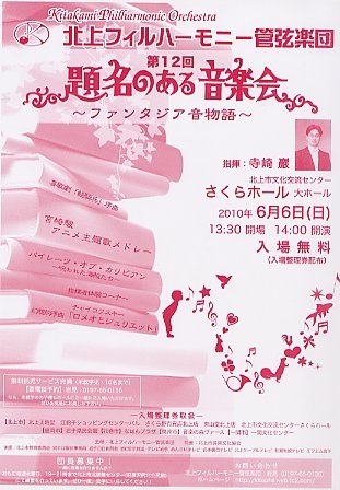 〜ファンタジア音物語〜 ・喜歌劇「軽騎兵」序曲 (スッペ) ・アニメ主題歌メドレー (宮崎 駿) ・パイレーツ・オブ・カリビアン (クラウス・バデルト) ・幻想的序曲「ロメオとジュリエット」 (チャイコフスキー) ほか 指揮 寺崎 巌 ■入場無料(整理券をお求めください) ■整理券は、北上フィル団員または、 次の場所でお求めください。 <北上市内> 【さくらホール】 【北上正時堂】 【江釣子ショッピングセンターパル】 【さくら野百貨店北上店】 【東山堂北上店】 <市外