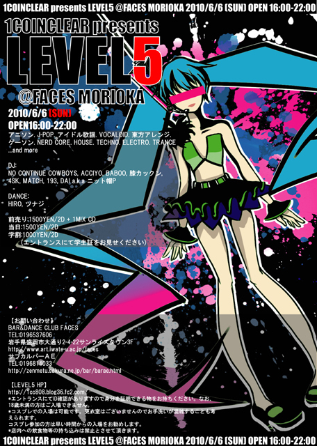 管理人様、盛岡で逢いましょうの皆様、告知失礼します。 盛岡でついにスタート! 同人音楽・アニソン・アイドル歌謡・東方アレンジ・TECHNO POP...などなど、コスプレOKのクラブイベントを開催します!! 2010/6/6(SUN) 1COINCLEAR presents LEVEL 5 @FACES MORIOKA アニソン.J-POP.アイドル歌謡.VOCALOID.東方アレンジ.ゲーソン.NERD CORE.HOUSE.TECHNO.ELECTRO.TRANCE...and more OPEN/16:00-22:00 (予定) 前売り:1500YEN/2D + 1MIX CD 当日:1500YEN/2D 学割:1000YEN/2D (エントランスにて学生証をお見せください) *エントラン