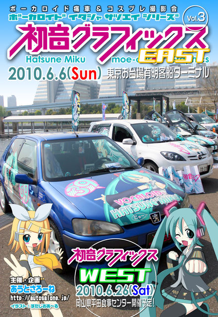 初音ミク等ボカロ系オンリー痛車の展示会「初音グラフィックス3」の開催を検討しています。 また今回は痛車グラフィックスのTEAM VOCALOID取材・撮影も兼ねてのイベントにしようと思っています。 取材に関してはいつも通り車の紹介だけではなく、チームボカロの特徴である「部活動」をフィーチャーしての記事を目指すつもりです。 ここぞとばかりに各部活の勇姿を見せつけて下さいw 特にラジコンや人形など小物関係をお持ち頂ければPRになるかと思います。(惨劇部も?) 今回はTEAM VOCALOIDとしての痛G取材です。 参加すれば必ず