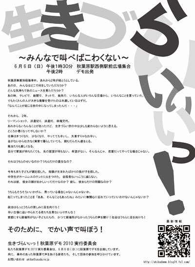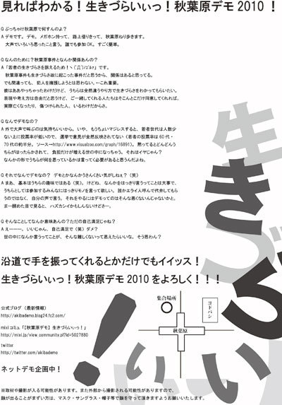 【秋葉原デモ2010】いきづらいぃぃぃっ!(# ̄З ̄) 〜みんなで叫べばこわくない〜 2010年6月6日(日) 秋葉原駅西側駅前広場 集合 午後1時30分 デモ出発 午後2時 公式ブログ http://akibademo.blog24.fc2.com/ 【秋葉原デモ】生きづらいぃっ! http://mixi.jp/view_community.pl?id=5027880 秋葉原無差別殺傷事件。あれから2年が経とうとしている。 あの日、みんなはどこで何をしていただろうか? どんな気持ちであのニュースを見ただろうか? あの時、テレビで、新聞で、ネットで、街角で、いろんな人