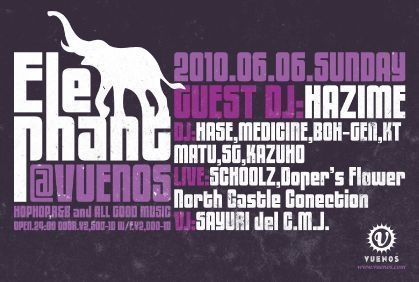 管理人様告知失礼致します 前回、雨の中長蛇の列を作り続けたビッグパーティー"Elephant "が今月も大きな足音と共にやって参ります 今回のGUESTはDJ HAZIME マチガイナイスキルと選曲でフロアをロックします 若手レギュラー陣も日曜のVUENOSに新たな旋風を巻き起こすにふさわしいタレントが勢揃い 日曜の夜のご予定にお困りの皆様、一緒に踊って騒ぎましょー ゲスト希望の方はお名前と人数をそえてメッセージ送って頂ければゲストお取り致します またエントラ
