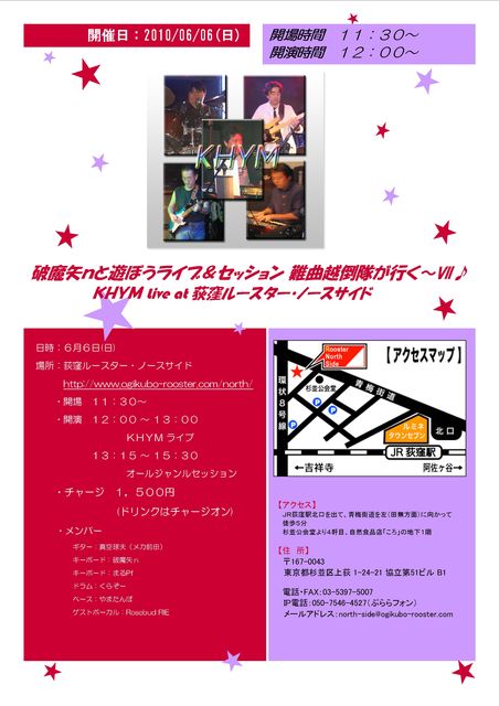 風の噂でジャカルタの国営TVに出演を果たし、とうとう現地人と化してしまった(爆)あのスーパー鍵盤師の破魔矢nさんの一時帰国に合せての、ライブ&セッションをしま〜す♪ 第1部は、バンド演奏タイムとして、KHYMでの演奏をお送りいたします♪ 第2部は、破魔矢nさんと一緒に遊ぼ〜セッションタイムとなります♪ なお、セッションのホストバンドはKHYMが努めます♪ G:メカ前田 K:破魔矢n K:まるPf D:くらぞー B:やまたんぼ Vo:Rosebud RIE(ゲスト) 【破魔矢nと遊ぼうライブ&セッション