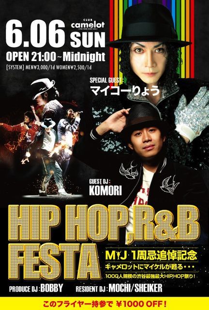 管理人様、告知失礼致します。 今週末! 渋谷キャメロットにてマイケルジャクソン一周忌追悼記念のイベントが開催されます 出演者もDJ KOMORIを筆頭にDJ BOBBY, DJ MOCHI, DJ SHEIKER他、渋谷の数々のパーティをロックしてきたDJ陣や 実力派ダンスチーム達によるバトルに加え、 今回はなんとSPECIAL GUEST SHOW CASEとしてお笑い芸人マイコーりょうも参加します 豪華な面々とともに盛大な一夜をマイケルに捧げましょう!! ディスカウントゲスト受け付けます♪ 参加希望の方は、お名前