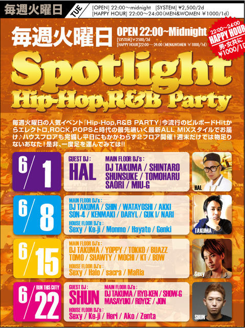告知失礼します。 6/8の火曜は -HipHop, R&B Party- 『SPOTLIGHT』@camelot です♪ ---------------------------------------------- 『SPOTLIGHT』とは...? ◆平日にも関わらず、HIPHOPフロア、HOUSEフロアの2フロアをオープンし、 毎回300名近くのお客様が遊びに来ています。 ◆ゲストのお客様は、終日男性1000円/1Drink、女性1000円/2Drink、というお得 な価格でご入場出来ます。 ◆第二火曜のSpotlightは他の週とは一味違った企画を用意しています。 渋谷や都内各所で活躍する実力派のレギュラーDJ陣が毎月代わる代