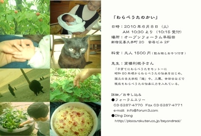 管理人さま、コミュニティのみなさま、こんにちは。 早稲田で定期的にわらべうたのかいを開いています。 Ding DongのCueです。 6月8日(火)午前10時30分から、 オープンフォーラム早稲田で 「わらべうたのかい」を開きますので、 みなさんにお知らせ致します。 これまで、何度もわらべうたのかいを開き、 生まれたばかりの赤ちゃんから、 小学生のお姉ちゃんたち、 そのお母さん、お父さんたちと、 たくさんの皆さんにわらべうたを楽しんでいただきました。 限られた数の音で作ら