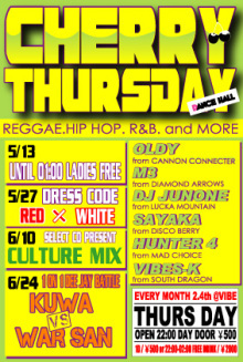 CHERRY THURSDAY EVERY MONTH 2・4 THURSDAY 2K10.06.10(THU) @VIBE OPEN/START 22:00〜 DAY/500 1D ORDER 22:00〜2:00 FREE DRINK/2000 SELECT CD PRESENT CULTURE MIX RESIDENT SELECTOR OLDY fr.CANNON CONNECTER M3 fr.DIAMOND ARROWS DJ JUNONE fr.LUCKA MOUNTAIN HUNTER 4 fr. MAD CHOICE SAYAKA fr.DISCO BERRY VIBES-K fr.SOUTH DRAGON CHERRY SCHEDULE 6/24 1 ON 1 DEEJAY BATTLE KUWA vs WARSAN