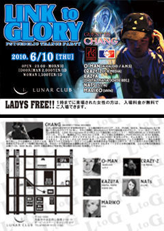 6/10(木)Psychedelic-Trance Party!! ☆Link to Glory☆ @ LUNAR CLUB 毎月、第2と第4【木曜日】に開催されている。 レギュラーPsychedelic Trance Party[LINK to GLORY]!略してリングロ! ゲストDJにYABAI RECORDSからHACKER!!のCHANGが登場! O-MANや CRAZY-Zを筆頭にフルオンDJからダークフルオンのDJまで勢ぞろい! ハッピアワーとして1時までにご入場の女性の方はエントランスフリー!(入場料無料!) 幅広いサイケデリックサウンドが縦横無尽に鳴り響く!! 平日からガッツリ遊びたいパーティーピーポーはLUNAR CLUBへ !!