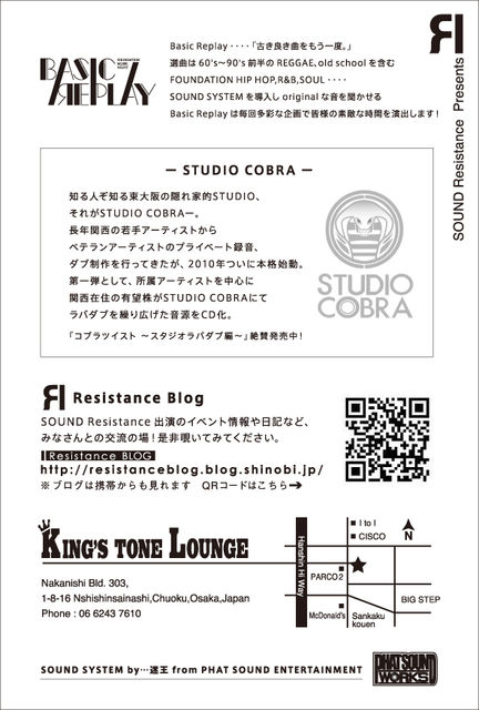 Resistance CREW Presents… 『Basic replay Special Edition vol.4』 2010.06.10(THU) @KING'S TONE LOUNGE START 23:00〜Till Morning ADM:\500 GUEST Artist/ STUDIO COBRA CREW SOUND/ SOUND Resistance . SCREW I . JUNYA S-STEADY . Jammy's Jr,KO-HEY . 5GR Resident Artist/ RIP STICK.LABBA BOOM Supported by…PHAT SOUND WORKS with SOUND SYSTEM ーSTUDIO COBRAー 知る人ぞ知る東大阪の隠れ家的STUDIO、それがSTUDIO COBRAー。 長年関西の若手アーティストからベテランアーティストのプラ