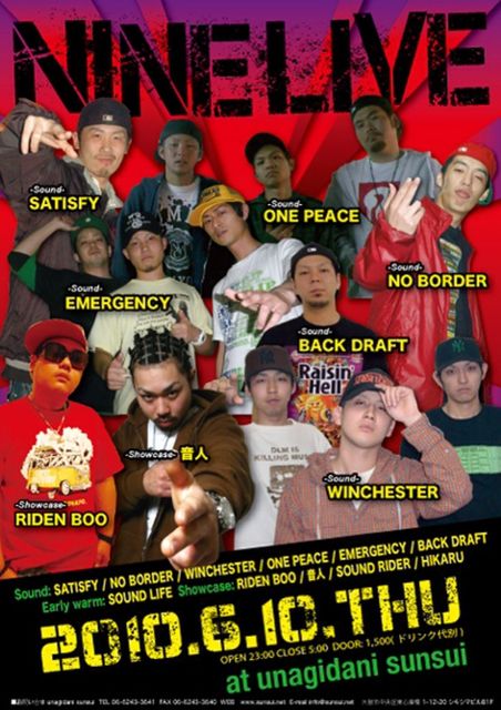 6月10日(木)は鰻谷SUNSUIにてNINE LIVE!! 大阪は心斎橋中心で活動してるSOUND、歌い手がやばぃ音とリリックをお伝えします!! NINE LIVE@鰻谷SUNSUI ◆SOUND◆ ・SATISFY ・NO BORDER ・WINCHESTER ・ONE PEACE ・EMERGENCY SOUND ・BACK DRAFT ◆EARLY WARM◆ ・SOUND LIFE ◆SHOW CASE◆ ・RIDEN BOO ・音人 ・SOUND RIDER ・HIKARU OPEN 23:00 CLOSE 5:00 DOOR:1500(1ドリンク) GUESTもありますので 是非遊びに来て下さい!!
