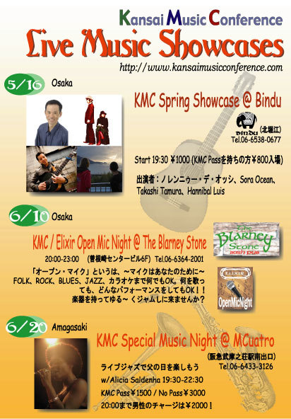 入場無料 KMC主催elixircafebar協力 KMC関西ミュージックカンファレンス2010というプロジェクトのためのイベント。 このKMCは国内外のミュージシャンを結集し、 音楽についてのレクチャーやワークショップを行いながら、 同時に期間中、関西のライブハウスやバーなどでミュージシャン達が分かれて演奏するという、関西のミュージックシーンを、グローバルに活性化−−−元気にするミュージックフェスティバルです。 昨年も、海外からも出演者がたくさん集まり、 日本に住む外国人や日本人のミュージシャン、音楽ファンと交流を図