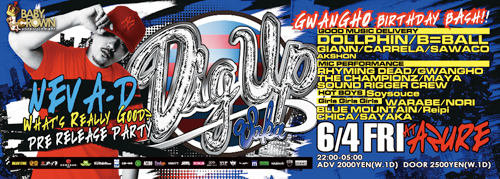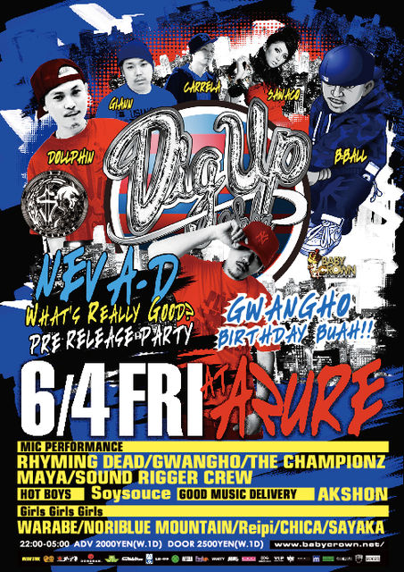 管理人様 告知失礼いたします。 毎月第1金曜日はclub AZUREで鉄板PARTY DIG UP OSAKA!!! 今回はレギュラーメンバーでお届けするもいつもとは一味違います。 6/11(金)に[What's Really Good?]をRELEASEするNEVA-Dの先行RELEASE PARTY!!! 6/4当日はCDも先行発売いたします!!! 6月4日はぜひともCLUB AZUREへ!! みんなで朝まで遊びましょう!!! BABY CROWNのホームページ http://www.babycrown.net(携帯からはhttp://m.babycrown.net) で前売りチケット購入できます。 以下詳細です。 6/4 DIG UP OSAKA@AZURE