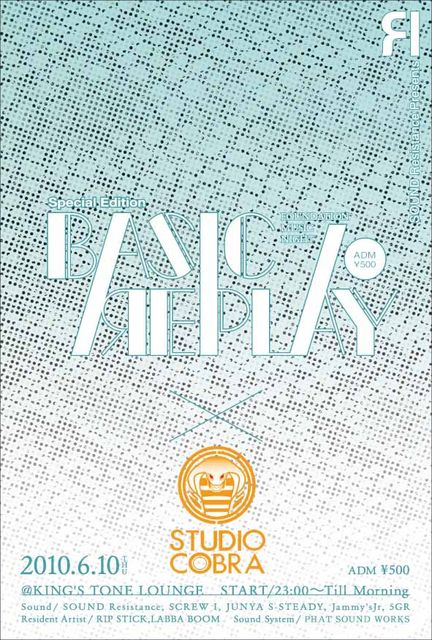 Resistance CREW Presents… 『Basic replay Special Edition vol.4』 2010.06.10(THU) @KING'S TONE LOUNGE START 23:00〜Till Morning ADM:\500 GUEST Artist/ STUDIO COBRA CREW SOUND/ SOUND Resistance . SCREW I . JUNYA S-STEADY . Jammy's Jr,KO-HEY . 5GR Resident Artist/ RIP STICK.LABBA BOOM Supported by…PHAT SOUND WORKS with SOUND SYSTEM ーSTUDIO COBRAー 知る人ぞ知る東大阪の隠れ家的STUDIO、それがSTUDIO COBRAー。 長年関西の若手アーティストからベテランアーティストのプライベー