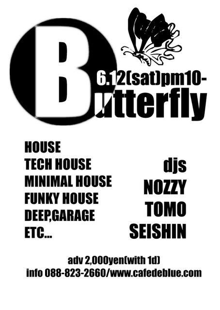 今回のButterflyはSEISHINとTOMOを招いてのONE NIGHT3人のDJが繰り広げるBUTTERFLY THE PARTY!
