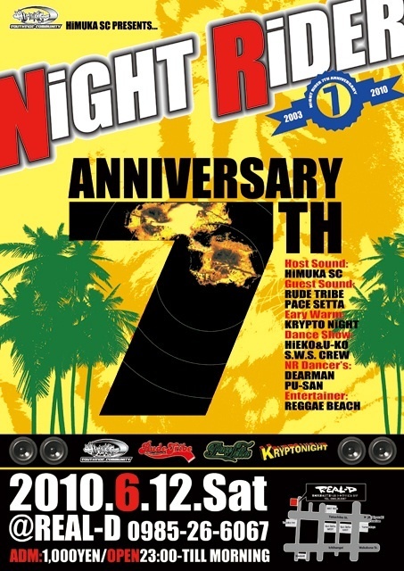 HiMUKA SC PRESENTS... NiGHT RiDER 7th ANNIVERSARY 2010.6.12.Sat @REALーD [TEL:0985-26-6067] ADM :1,000YEN OPEN 23:00-TILL MORNING ■Host Sound■ HiMUKA SC ◆Guest Sound◆ RUDE TRIBE PACE SETTA □Early Warm: KRYPTO NiGHT □Dance Show: HiEKO&U-KO S.W.S CREW □NR Dancer's: DEARMAN PU-SAN 宮崎の第2土曜を揺らし続けるNRことナイトライダー!!! おかげさまで7周年を迎えることになりました!!! 良質のレゲエミュージック、最高