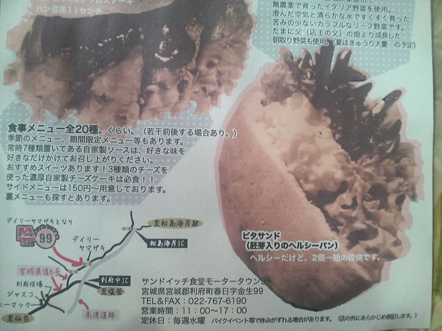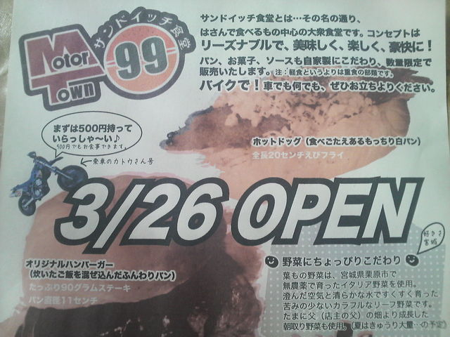 12日まで参加者募集中です 今年1回目のツーリングを開催します 初参加の方大歓迎 女性の方大歓迎 すでに、女性2名(初心者)の参加表明いただいております。 ですので、女性の方もお気軽に参加して頂いて大丈夫ですよ 目的地は、宮城県利府町にあるバイクカフェ 「サンドイッチ食堂モータータウン99」の予定です。 ※要望等により、変更する可能性もあります。 【モータータウン99】 mixiコミュ http://mixi.jp/view_commu