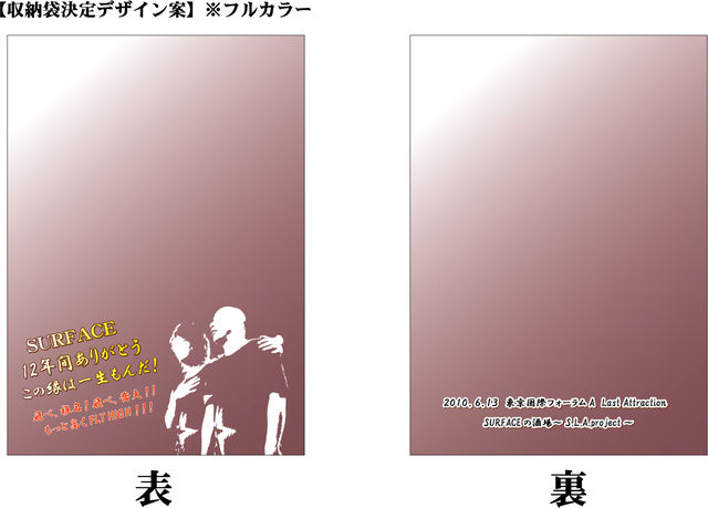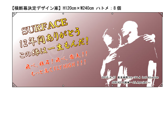 【告知・募集】タオルつくりませんか??? SURFACE解散にあたり、 思い出の品を何か作りたいと思って、いろいろ考えたんですが 「スポーツタオル」に落ち着きました。 詳細は以下の通りです。 納期の都合上、トピ立てから締め切りまで時間が少ないですが、 企画意図に賛同いただける方、是非一緒に作りましょう。 ライヴに行かれる方ばかりじゃないと思いますが、 同じタオル持ってライヴ参戦できたら楽しいなぁと思います。 【作るもの】 スポーツタオル 【サイズ】 縦40cm×横110cm 【予算】 50枚で、1