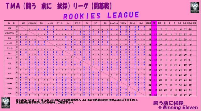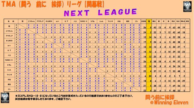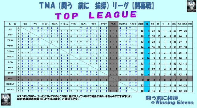 第一期 TMA(闘う 前に 挨拶)リーグ【開幕戦】 皆さんお疲れ様です この大会のコンセプトは『プレイヤーとしてのリーグ戦』です。←悟士さんのパクりました(笑) なので今回はいつもの大会と少しルールが違うのでルールを良く把握して参加して下さい 参加の際のお願い イベントに参加するを押して、ウイイレIDを必ず記入して下さい。 両方を必ずやって参加申請して下さい宜しくお願い致します。 ― 大会要綱 ― ☆大会開催期間 6/13〜約3ヶ月程度 (但し、途中に大会を