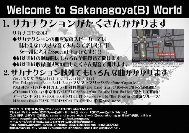 管理人様、失礼いたします。 名古屋で行うサカナクションのDJイベント サカナゴヤ(B) が前回 http://mixi.jp/view_event.pl?id=49449339&comm_id=209792 大好評で終わることが出来ましたので 早速第二弾を開催できることになりました! 今回は場所を大きくしまして サカナクションが「GO TO THE FUTURE」レコ発ツアーを行った JB'sで行うことになりました。 前回よりも大きな音で楽しめると思います!!!! ◆サカナクションの曲を家のスピーカーでは味わえない大