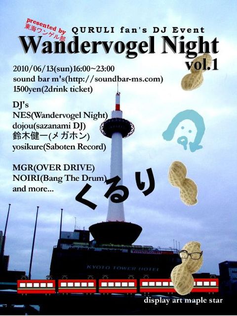 と、いうことで。 イベント立てました。 くるりの曲中心のクラブイベントです。 栄にある、とてもアットホームなクラブなので、 ワンゲル部にぴったりな ゆるくてたのしい感じになると思います。 東海ワンゲル部presents 『QURULI fan's DJ Event 〜Wandervogel Night Vol.1〜』 日付 2010年6月13日(日) 時間 16:00〜23:00(途中入場、退場、再入場自由) 場所 sound bar m's (http://soundbar-ms.com/) DJs NES(Wandervogel Night) dojou(sazanami DJ) 鈴木健一(メガホン) yo