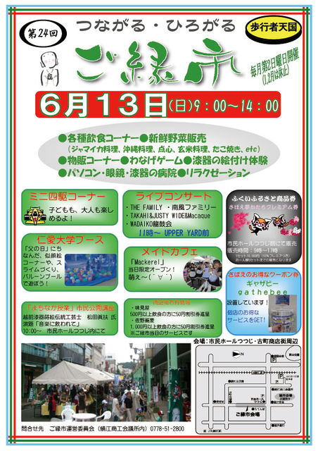 毎月第2日曜日開催 つながる・ひろがる ”ご縁市” 6月13日(日)9:00〜14:00 UPPER YARD前の商店街のお祭りです!! ・各種飲食コーナー (ジャマイカ料理、沖縄料理、玄米料理、たこやき、などなど) ・新鮮野菜販売 ・リラクゼーション、マッサージコーナー ・遊びのコーナー (ミニ四駆、輪投げ、バルーンルーム、似顔絵などなど) ・メイドカフェ ・ライブコンサート (南風ファミリー、THE FAMILY、WADAIKOる龍鼓会、TAKAHI&JUSTY WIDE) 時間ある方はあそびにきてください!!!