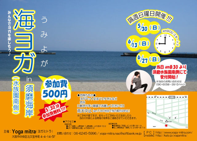 管理人様 いつもお世話になっております!! 貴重なスペースありがとうございます。 ◆◆◆「海ヨガ」in須磨海岸◆開催!!!!!◆◆◆ 青い空と青い海!! 気持ちのいいシチュエーションの中でヨガを楽しみましょう☆ 【日時】 6/13(日)、27(日) am9:00〜am10:30 雨天中止 (am7:00の時点で雨の場合は中止) 【場所】 須磨海岸(須磨海浜水族園南側) □最寄り駅はJR「須磨海浜公園駅」徒歩5分 □有料駐車場有 【参加費】 500円 【持ち物】 マット又はバスタオルなど敷くもの タオル お水 日焼け対策グッズ 【当日受付