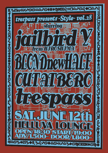 神戸のtrespassです、本日は自主企画の宣伝をさせてください! 6/12(土)神戸HELLUVA LOUNGE(http://helluva.jp/lounge/) trespass presents“Style”vol.28 【jailbird Y 1st ALBUM『JAILBIRD Y』release tour in kobe!!】 open18:30 start19:00 adv¥1500 door¥1800 ●jailbird Y(広島) http://www.myspace.com/jailbirdx ●BLONDnewHALF http://www.myspace.com/blondnewhalf ●OUTATBERO http://www.myspace.com/outatbero ●trespass http://www.myspace.com/trespass2 隔月開催自主企画の第28弾!今回は6/9に男道レコ