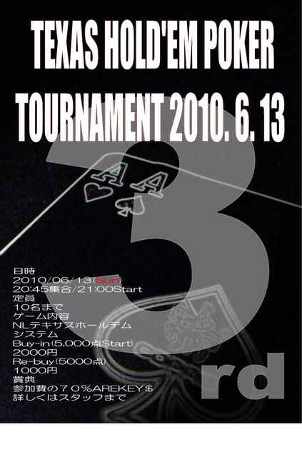 2010 3rd 6・13 TEXAS HOLD’EM POKER TOURNAMENT 毎月第二日曜日『ポーカートーナメント』を只今開催中デアリマス。 まだ、ポーカーをした事のないそこの貴方!! 少しはわかるそこの貴方!! プロ級の実力を持っているそこの貴方!! 参加を待ちしております。 ※初心者の方大歓迎だって・・店長も初心者デアリマス ポーカー初心者(やった事ない方)に優しく、楽しくお教え致します ■開催日 毎月第二日曜日 ■時間 トーナメント