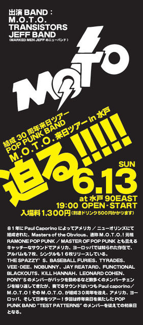 なんと結成30年にして初のJAPAN TOURをするMasters of the Obvious、通称「M.O.T.O.」がなんと水戸駅南 90EASTにやってきます!!(バックバンド