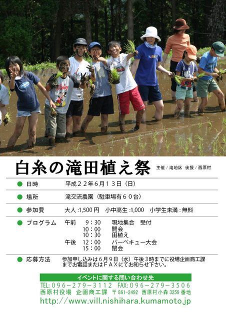 平成22年6月13日(日)に西原村滝地区の滝交流農園において、先着120名様限定で、田植え祭りが実施されます。 田植え体験の後、バーベキュー大会も計画されています。 昔ながらの田植えを体験され、おいしい西原さんお米のおにぎりを、食べませんか? 皆様の参加を、お待ちしております。 日時 平成22年6月13日(日)午前9時30分集合 場所 滝交流農園(駐車場60台) 参加費 大人1500円 小中高生1000円 応募方法 参加申し込みは6月9日(水)午後3時までに、西原村役場企画商工課までお電話又はFAXでお知