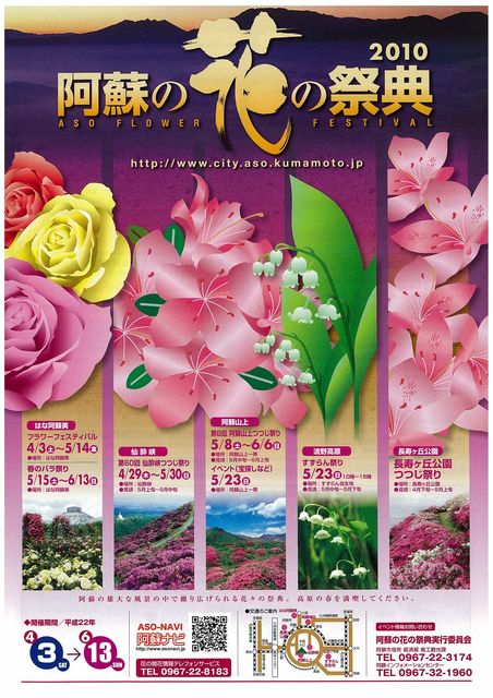 阿蘇市ではさまざまなお花に関するイベントが開催中です。 大変きれいな、お花が阿蘇中に咲いて、皆様のお越しをお待ちしております。 ぜひ、遊びに来て下さい。 阿蘇の雄大な風景の中で繰り広げられる花々の祭典。高原の春を満喫してください。 「第60回仙酔峡つつじ祭り」 日程 平成22年4月29日〜5月30日場所 仙酔峡 「第8回阿蘇山上つつじ祭り」日程 平成22年5月8日〜6月6日 場所 阿蘇山上一帯 「フラワーフェスティバル」 日程 平成22年4月3日〜5月14日 場所 はな阿蘇美(阿蘇市)