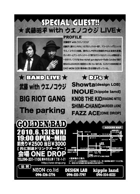管理人様、度々の告知で失礼します。 ONE DROPダイニングスタジオのはなです。 前日の6月12日(土)のThe ZOOT16のLIVEに引き続き 6月13日(日)は武藤昭平withウエノコウジLIVEが決定!! 勝手にしやがれのヴォーカル&ドラマーの武藤昭平氏の ソロプロジェクトの一環で 元ミッシェルガン・エレファントのベーシスト ウエノコウジ氏とアコーステックユニットを始動。 ガットギター&アコーステック・ベースで奏でられるサウンドは スパニッシュな情熱を放つ!! 勝手にしやがれの楽曲はモチロンの事 先日リリースさ