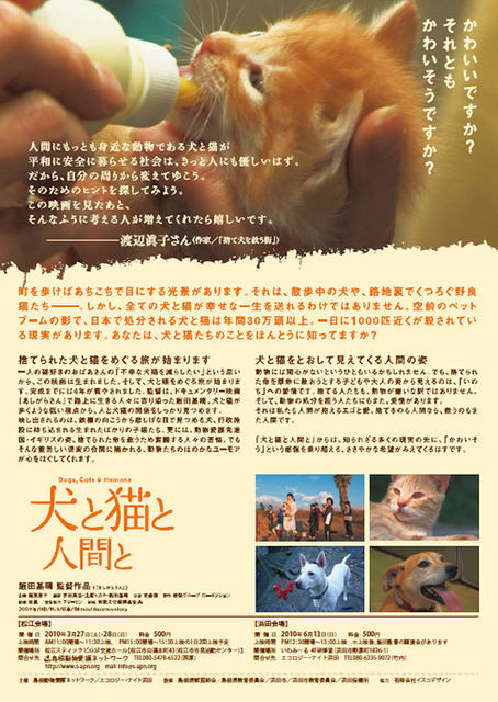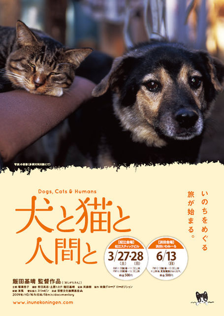 映画「犬と猫と人間と」浜田上映会のお知らせです↓。 開催日:2010年6月13日(日) 料 金:500円 開催場所:いわみーる4階研修室(島根県浜田市野原町1826-1) 上映時間:12:30会場、13:00開演(上映時間約2時間) ※上映後、飯田監督の講演があります もうこれで島根県内での劇場公開は無いんじゃないかと思います。 しかも当映画の監督・飯田さんに遠路はるばるお越し頂き、上映後に講演を行っていただく予定! 二度とないチャンスですよ〜!まだ見てないという方は是非!