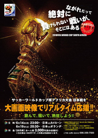 サッカーW杯南アフリカ大会 日本戦を ながれの大画面映像でリアルタイムで応援しよう!! [日時] 6月14日(月)/23:00~ -日本vsカメルーン- 6月19日(土)/20:30~ -日本vsオランダ- [料金] 前売券/お一人様3,000円(飲み放題付) ※当日券は+500円です。※料理は別途掛かります。 ※満席が予想されますので、あらかじめご予約・チケット購入されることをおすすめ致します。 ※興奮しすぎての暴動・ケンカなどはご遠慮下さい。 ※スタッフも一緒に応援したいので、お料理などの無茶なご注文はお控え下さい。 ちゅうことで、熊本の熱き魂