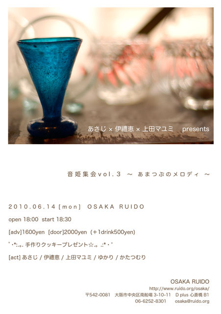 あさじ×伊禮恵×上田マユミpresents『音姫集会vol.3』 あまつぶのメロディー ■2010/06/14(mon) ■大阪RUIDO ■open/18:00 start/18:30 ■adv/\1,600(+1D) / door\2,000(+1D) ■w/あさじ/上田マユミ/ゆかり/かたつむり ついに音姫集会vol.3です♪ 今回もプレゼントあり(^ω^)むふふ 女の子の世界へ ふわふわ遊びに来てください*