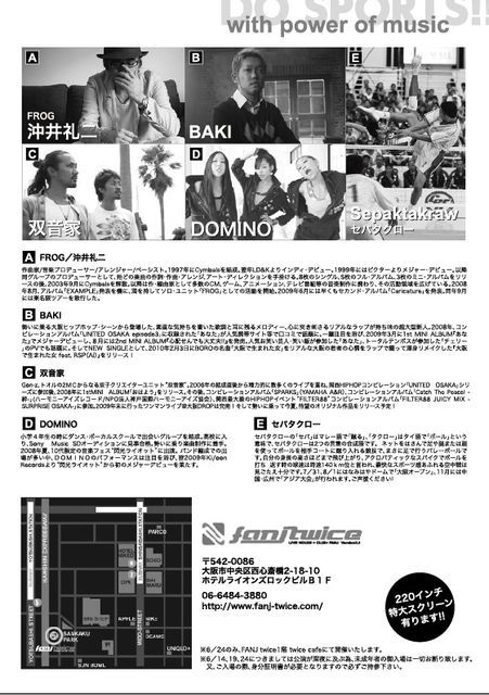 告知させて下さい! 音楽とスポーツのコラボレーションをテーマに、主に大阪・アメリカ村、FANJ twiceで不定期に開催しているイベント『DO SPORTS!!』といいます。音楽好きなアスリート、スポーツ好きなミュージシャンを招いて、スポーツのビッグイベントに合わせて開催しています。 サッカーのワールドカップに合わせて開催する次回イベントに、 BAKIさんに出演して頂くことになりました!! BAKIさんと一緒にワールドカップを応援しませんか? ご来場をお待ちしています!! 『DO SPORTS!! 〜サッカー日本代表応援4連戦〜?』
