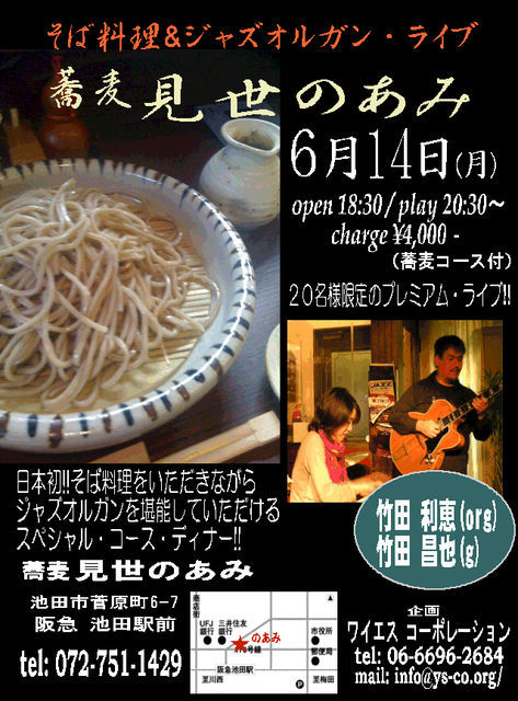 第2回蕎麦料理&ジャズオルガンライブがあります 日時;6月14日(月)open;18:00 1st;18:30 2nd;20:30 料金;¥4,000(蕎麦料理コース付き) 場所;蕎麦見世のあみ 072−751−1429 池田市菅原町6−7 阪急池田駅前 演奏;竹田利恵(org)竹田昌也(g) 企画;YSコーポレーション06−6696−2684 ※限定20名のプレミアムライブですので要予約 このミクシーでも受け付けています 。 美味しい蕎麦とお酒を頂きながらのオルガンライブ最高です 写真2は第1回目