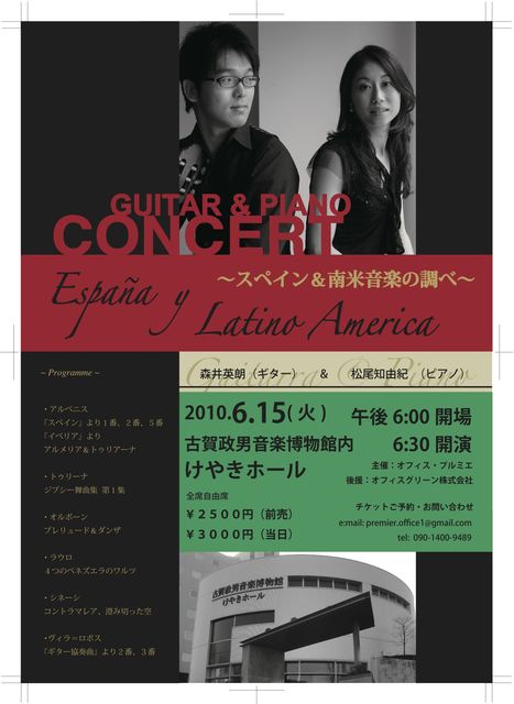 ピアノによるスペインの音楽&ギターによる南米音楽のコンサートのご案内です。 プログラム ピアノ:アルベニス「スペイン」より1、2、5番。 「イベリア」よりアルメリア、トリアーナ トゥリーナ「ジプシー舞曲集、第1集」 ギター:オルボン「前奏曲と踊り」 ラウロ「4つのベネズエラワルツ」 シネーシ「コントラマレア」「澄み切った空」 ヴィラ=ロボス「ギター協奏曲」より2、3番。 〜スペイン&南米音楽の調べ〜 Espana y Latino America 2010年6月15