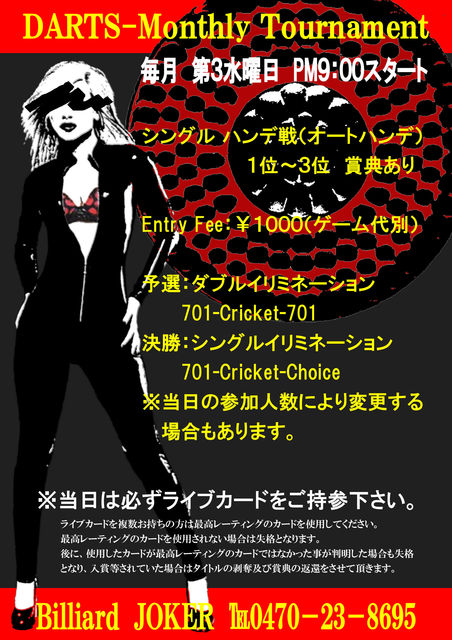 シングル ハンデ戦(オートハンデ) 1〜3位 賞典あり Entry Fee: \1,000(ゲーム代別) 予選:ダブルイリミネーション又はラウンドロビン [701-CRICKET-701] ※参加人数により対戦形式を変更 決勝:シングルイリミネーション [701-CRICKET-CHOICE] 注)当日はライブカードを忘れずにご持参下さい。 (複数枚お持ちの場合は最高レーティングのもの)