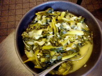 (Seasoned green vegetables and okra served with white, long-grain rice)
