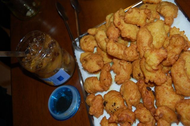 (Fried split-pea fritters served with spicy, sweet mango sauce)