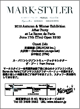 今夜は怒涛の急成長を遂げているMARK-STYLER傘下の6ブランド;MERCURYDUO、MURUA、EMODA、Laguna Moon、dazzlin、HAN AHN SOONの合同展示会アフターパーティー!ファッションフォワードなこのパーティーに登場するDJ陣、渋すぎます!先ごろ全国巡業を終えた