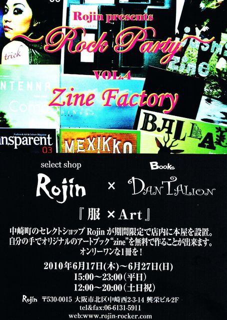 『Zine Factory』 『Rock Party』第4弾は、webにてインディーズ自主制作誌を販売する本屋『Books DANTALION(ブックス ダンタリオン)』サカイ タツローとの異色コラボレーション。 『Do it yourself(できることは全部自分で)』というテーマを掲げる彼に、Rojinが賛同。 Books DANTALIONは、インターネット主流の現代マスメディアに対するアンチテーゼから、出版社を通さず、有志の人々が制作する小部数の出版物=『zine(ジン)』しか取り扱わない。そこには現代社会が失ってしまった紙媒体の古き良き初期衝動が感じられる。 今回は期間限定